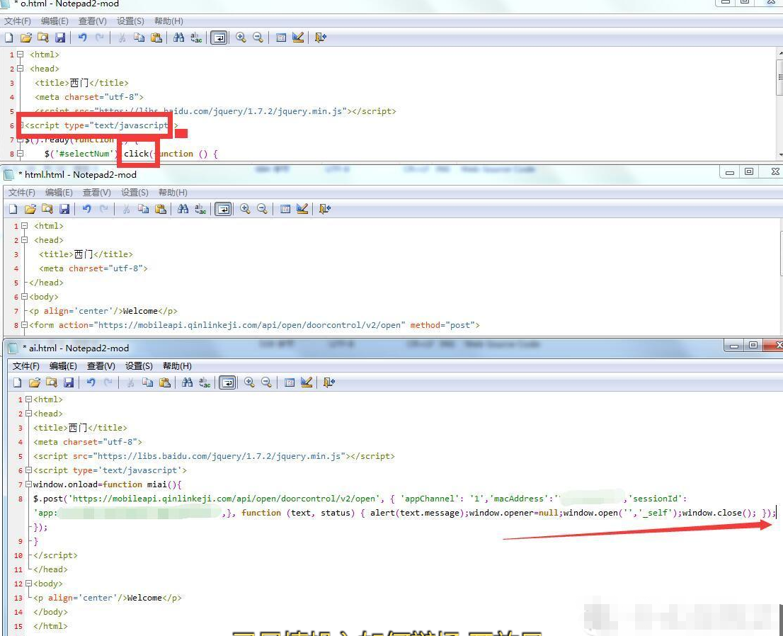 1.7 设置html代码post提交,当网页load时候或则ready时候使用js 自动post提交,我是业余水平,所以直接网上找了功能,自己修改了一下。html代码设置了一个button点击芝麻开门click按钮开门的是给亲朋好友访客用的,网页点一下就可以开门,我自己用ai.html那个,要防止重复提交设置了关闭窗口,虽然手机不起作用