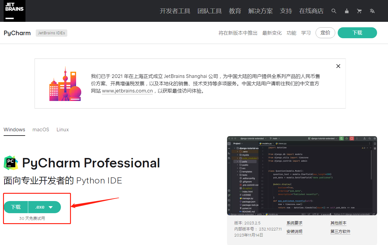 访问 Pycharm 官网,下载 Pycharm 2023.2.4 版本的安装包,下载链接如下 :