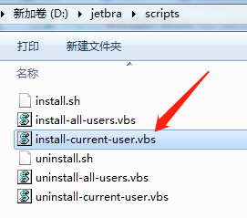 点击进入 /jetbra 补丁目录,再点击进入 /scripts 文件夹,双击执行 install-current-user.vbs 破解脚本: