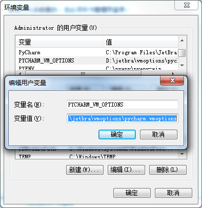 Pycharm_VM_OPTIONS变量,变量值为/jetbra文件夹下的.vmoptions参数文件绝对路径,如下所示: