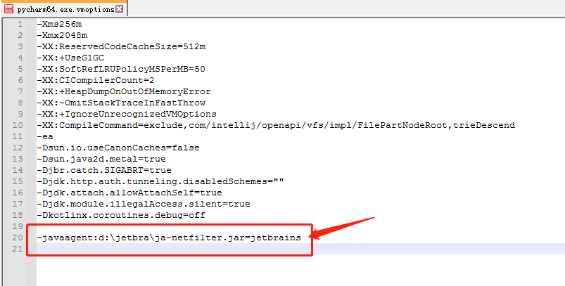 然后,脚本在 pycharm.vmoptions 文件中引用了破解补丁 :