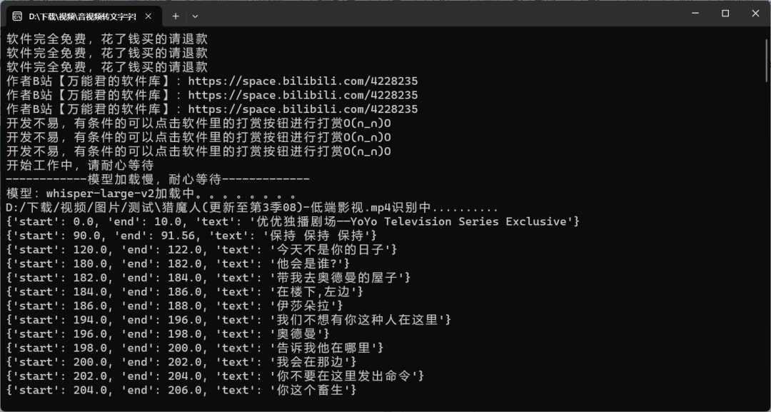 然后趣哥测试一个小时的视频,需要一二十分钟才能转换完成,当然这和视频本身和电脑配置有关,另外有可能翻译到一半炸了