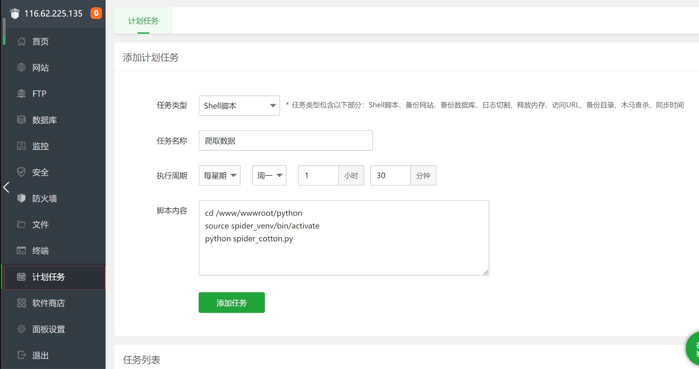 记录一下开发过程中编写的一个python脚本部署在宝塔面板上配置定时执行的过程