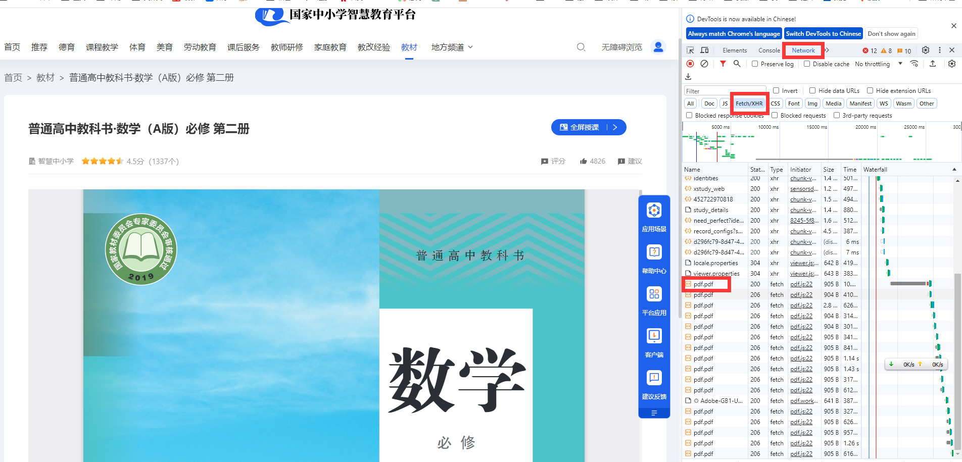 在课本页面,按F12打开控制台,然后进NETWORK(网络),筛选“Fetch/XHR”,可以看见PDF.PDF,这个PDF就是课本PDF,