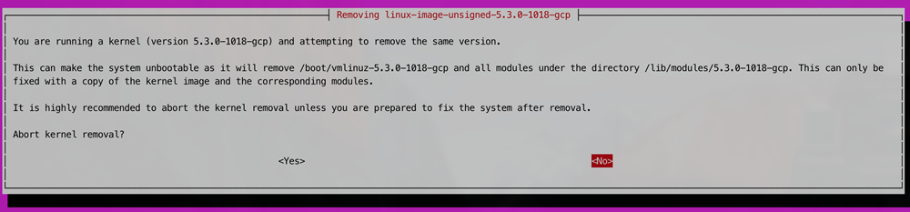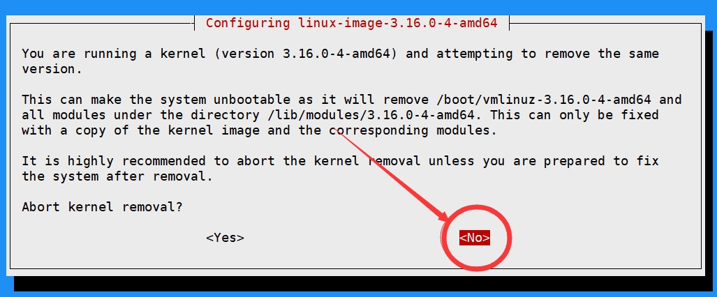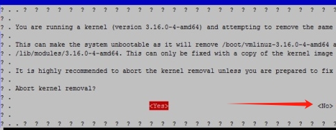 - 注意安装过程中 如果弹出大框的英文提示(下面有示例图) “安装linux内核有风险是否终止”, 要选择” NO” 不终止. 安装完毕会重启VPS.