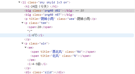 然后按F12开始分析网页结构,找到各个标签,并分析它们的作用。h1:日期;p:天气;tem-span:最高温;tem-i:最低温;win:风;em:风向;win-i:风力。