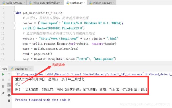 上面代码执行结果截图如下:成功爬取每日鸡汤,第一步实现。