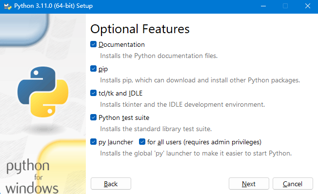 安装Python2:这里需要将最后一行添加 python.exe 到环境变量中选中,将默认安装与python相关的环境及工具,然后继续“Next”就安装完成。
