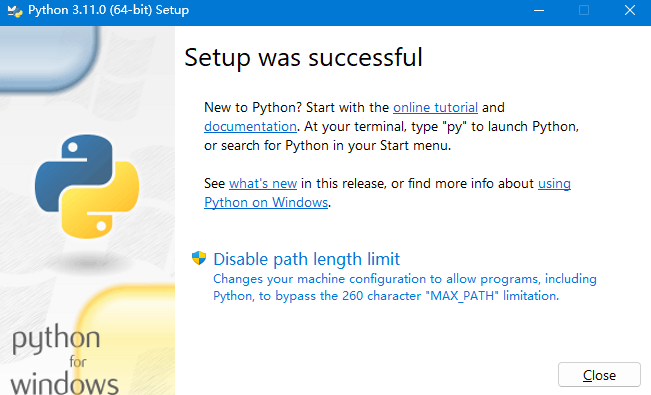 到这里已经完成了对python3的安装,点击关闭即可关闭界面