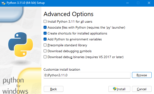 安装Python3:选择添加python.exe到PATH环境变量中,第二步选择自定义路径安装
