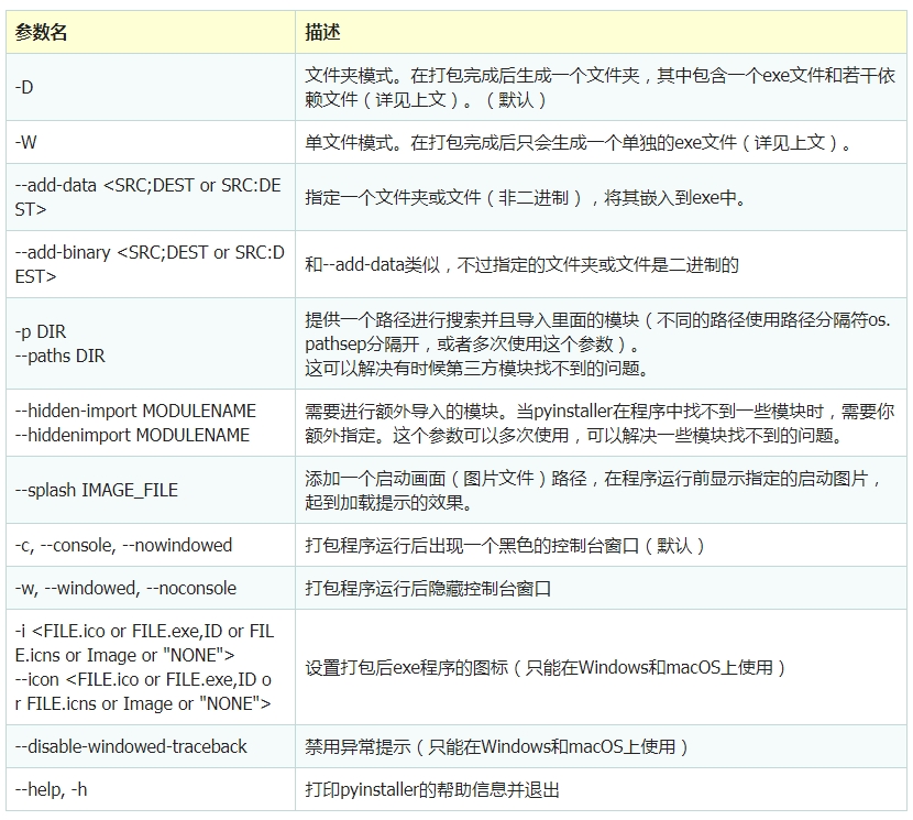 调用命令时,首先给出工具名称(比如上面的 pyinstaller ),然后提供相关参数,有一些参数是可选的但不需要附带任何值(比如上面的 -D ),有一些参数是必选的(比如上面的 myscript.py ),有一些参数需要附带一个值(比如上面的 -i “icon.ico” )。其中有一些参数可以简写(比如 -i 就是 –icon 的简写)。
