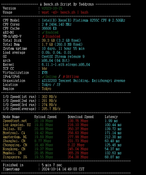 ZBench版一键测试脚本,集成了以上两个一键测试的主要功能,可以同时测试国内外连接速度,便也有稍许不足。