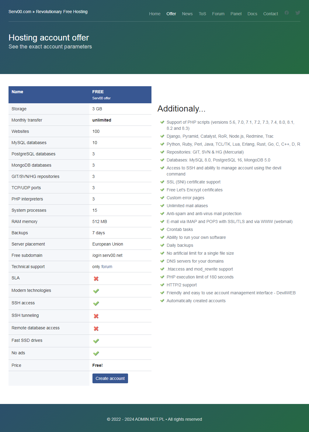 免费:Serv0提供长达10年的免费服务期限,无需支付任何费用。 -