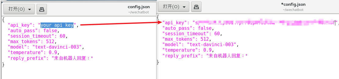 打开config.json文件,将前面获取的密钥粘贴到api_key那里,然后就可以保存退出去启动项目了